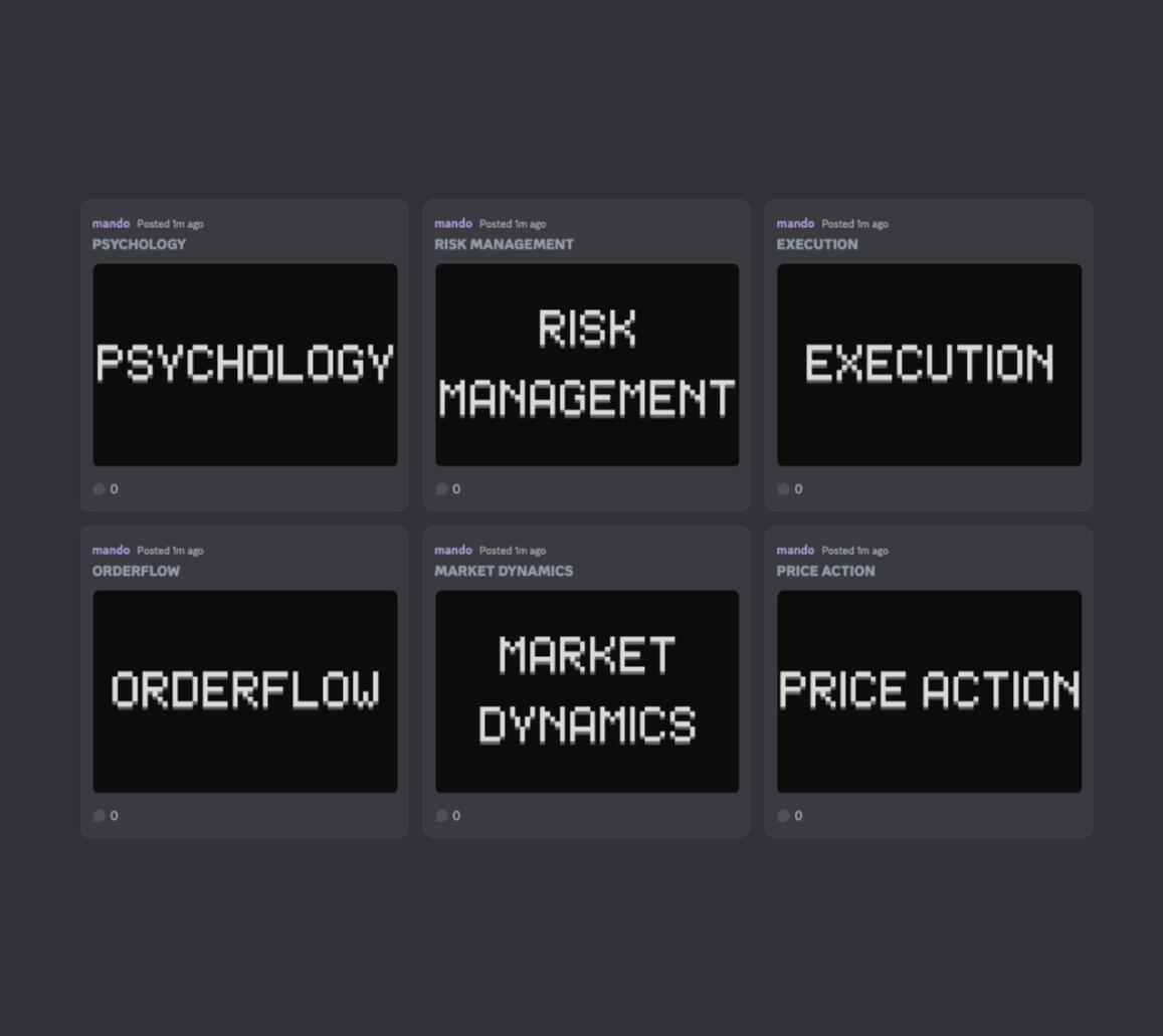 Follow our structured curriculum to enhance your trading. Whether you're a beginner building your foundation or an advanced trader refining your strategy, it covers everything from price action and orderflow to market dynamics and execution, equipping you with the skills to trade confidently.